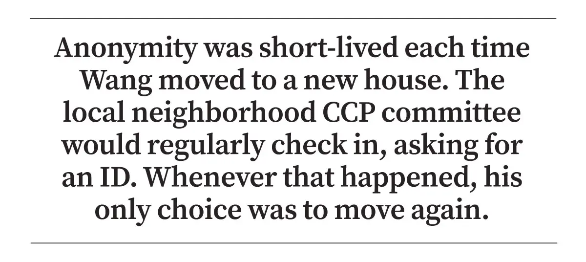 Anonymity was short-lived each time he moved to a new house. The local neighborhood CCP committee would regularly check in, asking for an ID. Whenever that happened, his only choice was to move again.