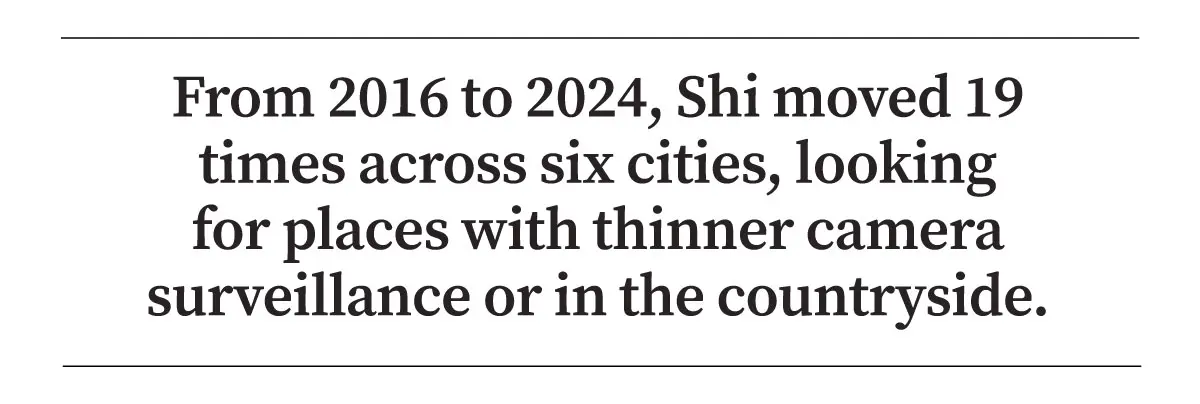 After that, Shi went into hiding. Over the next eight years, she moved 19 times across six cities, looking for places with thinner camera surveillance or in the countryside.