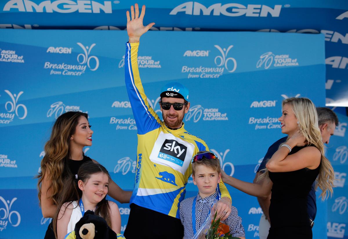 Sir Bradley Wiggins of Team Sky, accompanied by his children, Isabella and Ben, is awarded the yellow jersey following Stage Eight of the 2014 Amgen Tour of California. (Ezra Shaw/Getty Images)