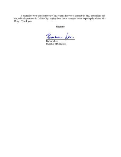 Ms. Lee stated, “Ms. Kong practices Falun Gong and was taken into custody without just cause for peacefully exercising her religious beliefs. Consequently, I have deep concerns regarding the well-being of Ms. Kong during her confinement by the authorities of the People’s Republic of China (PRC).”
