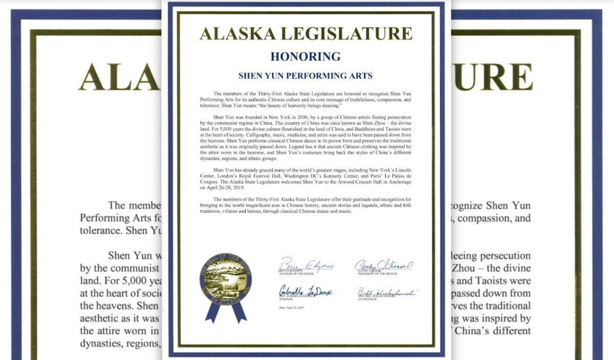 The combined Alaska State Legislature, composed of both the House and Senate, issued a citation in recognition of Shen Yun Performing Arts on Apr. 22, 2019.