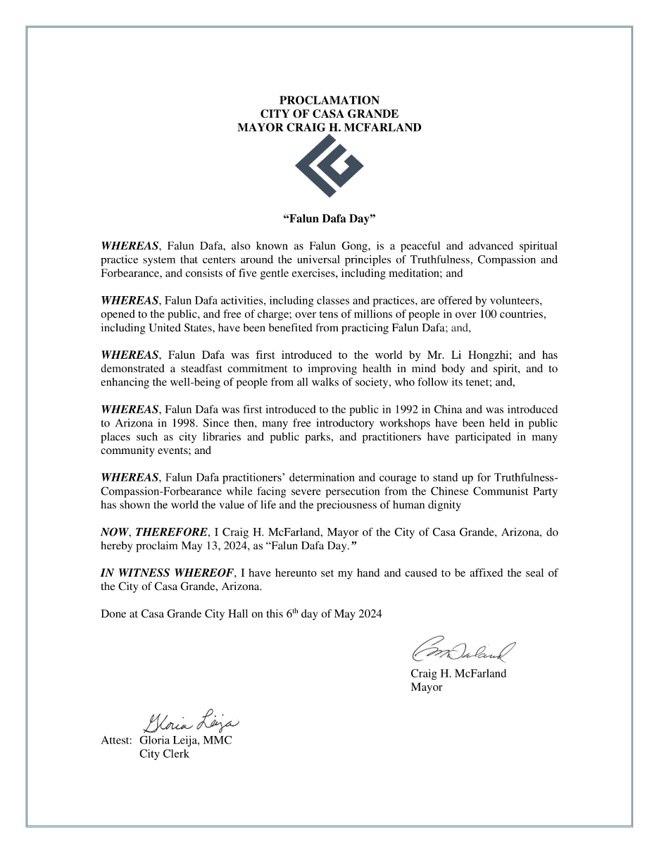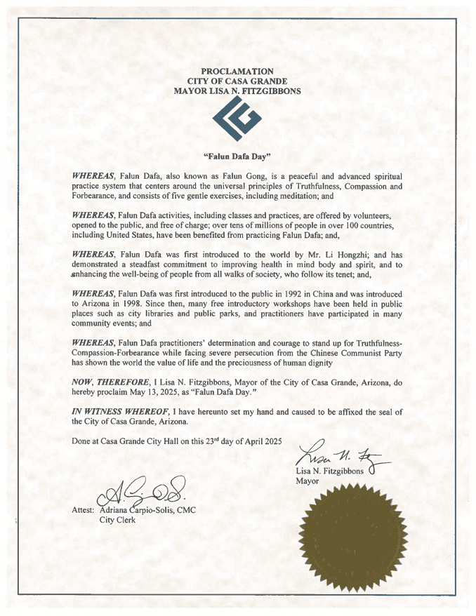 Casa Grande’s newly elected mayor, Lisa N. Fitzgibbons, likewise declared May 13 as Falun Dafa Day prior to the celebration in April.