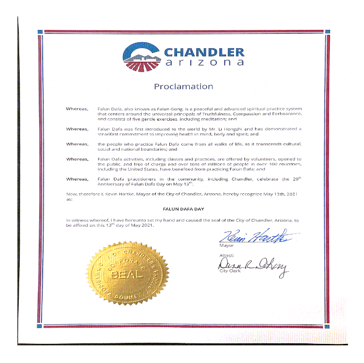 Mayor Kevin Hartke of Chandler has been issuing a proclamation to recognize May 13 as Falun Dafa Day for several years since assuming office in 2019. Hartke declared the celebration in 2021, 2022, 2023, and 2025.
