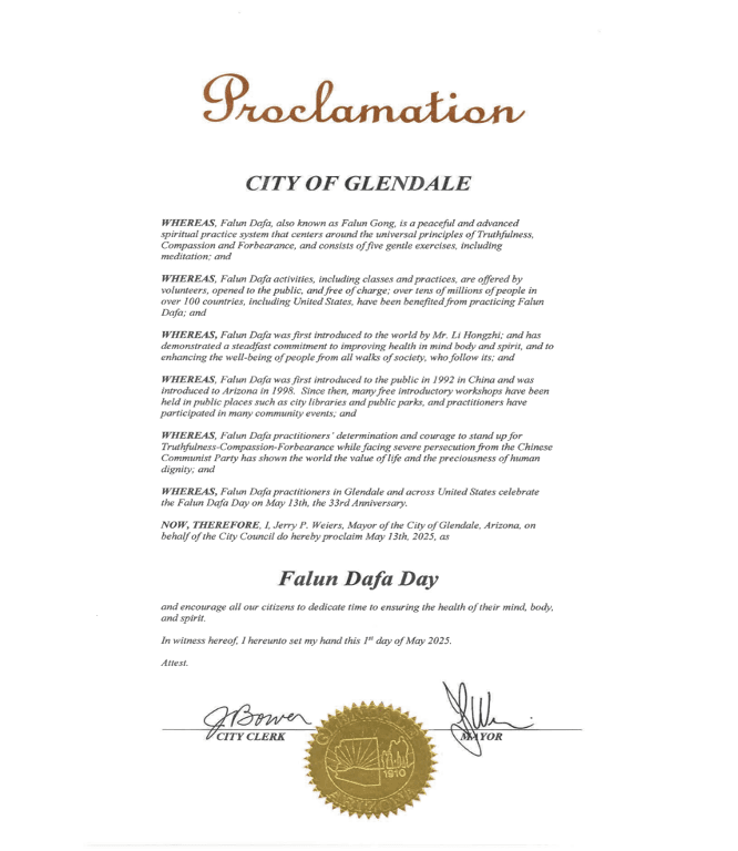 To mark the celebration, the mayors of five Arizona cities—Phoenix, Chandler, Glendale, Prescott Valley, and Casa Grande—issued proclamations recognizing May 13, 2025, as Falun Dafa Day in their cities.