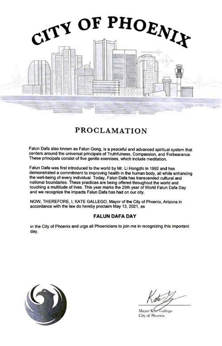 Phoenix Mayor Kate Gallego issued a proclamation ahead of the global celebrations, recognizing the values of Falun Dafa.