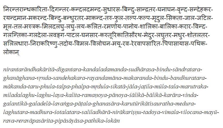 “In it, the distress, caused by thirst, to travellers was alleviated by clusters of rays of the bright eyes of the girls; the rays that were shaming the currents of light, sweet and cold water charged with the strong fragrance of cardamom, clove, saffron, camphor and musk and flowing out of the pitchers (held in) the lotus-like hands of maidens (seated in) the beautiful water-sheds, made of the thick roots of Andropogon muricatus mixed with marjoram, (and built near) the foot, covered with heaps of couch-like soft sand, of the clusters of newly sprouting mango trees, which constantly darkened the intermediate space of the quarters, and which looked all the more charming on account of the trickling drops of the floral juice, which thus caused the delusion of a row of thick rainy clouds, densely filled with abundant nectar.”