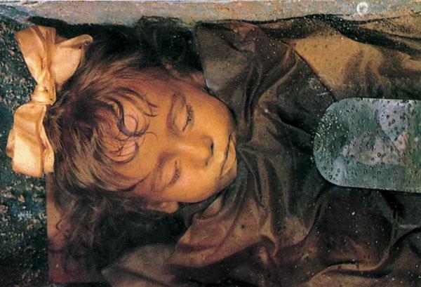 The Capuchin Catacombs of Palermo are located in Sicily, Italy. In the 16th century, the Capuchin monks of Palermo discovered that their catacombs contained a natural preservative that helped mummify their dead. One of the most famous mummies is that of a two year old girl, Rosalia Lombardo. Rosalia was placed in the catacombs when she died in 1920. Her body is so well preserved that she looks as if she were just sleeping in her glass coffin, hence her nickname “Sleeping Beauty”. The secret for her excellent state of preservation was revealed a few years ago, when a hand-written memoir of the embalmer, Alfredo Salafia, was discovered. This memoir recorded the chemicals that he injected into Rosalia’s blood. These chemicals were formalin, zinc salts, alcohol, salicylic acid, and glycerin. It has been suggested that it was the zinc salts that were most responsible for Rosalia’s amazing state of preservation.