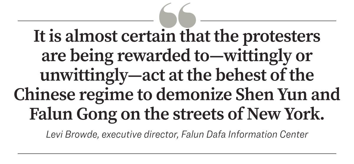 “It is almost certain that the protesters are being rewarded to—wittingly or unwittingly—act at the behest of the Chinese regime to demonize Shen Yun and Falun Gong on the streets of New York,” he said in a statement.
