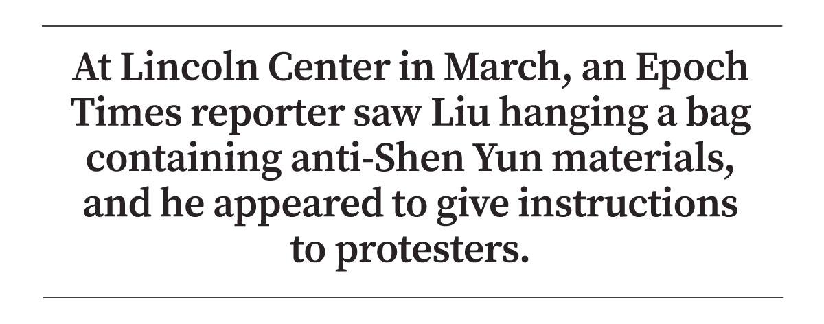 At Lincoln Center in March, an Epoch Times reporter saw Liu hanging a bag containing anti-Shen Yun materials, and he appeared to give instructions to protesters. On April 5, Liu was recorded following a practitioner into David Geffen Hall and making an offensive gesture, according to a video reviewed by The Epoch Times.