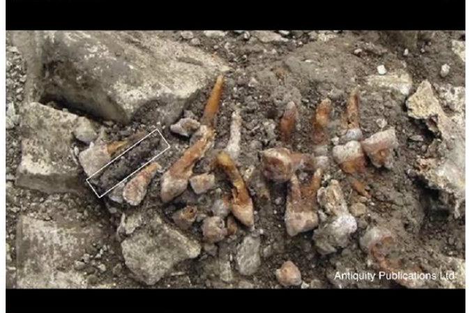 Excavation of teeth; the iron pin dental implant is indicated to the left of the teeth. (Screenshot/GeoBeats News/YouTube)