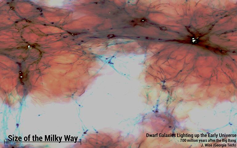 “It turns out they did form stars, usually in one burst, around 500 million years after the Big Bang,” says John Wise, a Georgia Tech assistant professor in the School of Physics who led the study. “The galaxies were small, but so plentiful that they contributed a significant fraction of UV light in the reionization process.”