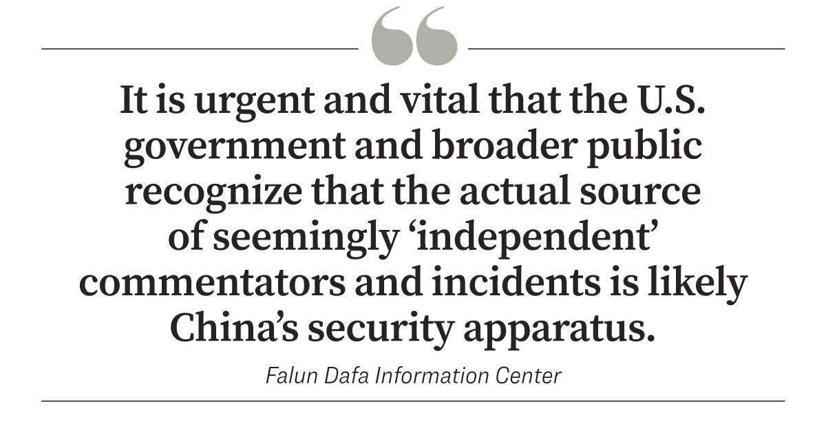 “It is urgent and vital that the U.S. government and broader public recognize that the actual source of seemingly ‘independent’ commentators and incidents is likely China’s security apparatus,” the FDIC said.