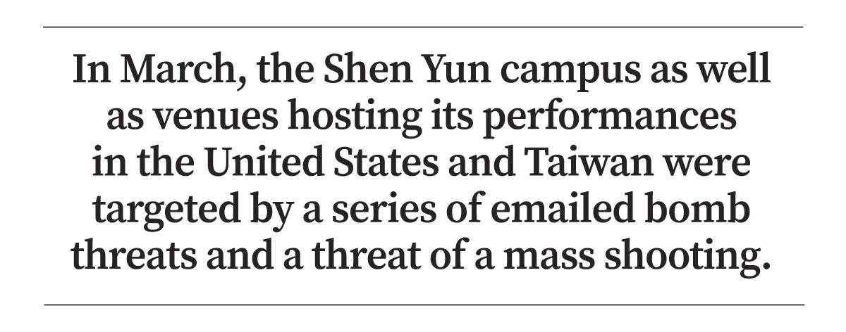 In March, the Shen Yun campus as well as venues hosting its performances in the United States and Taiwan were targeted by a series of emailed bomb threats and a threat of a mass shooting.