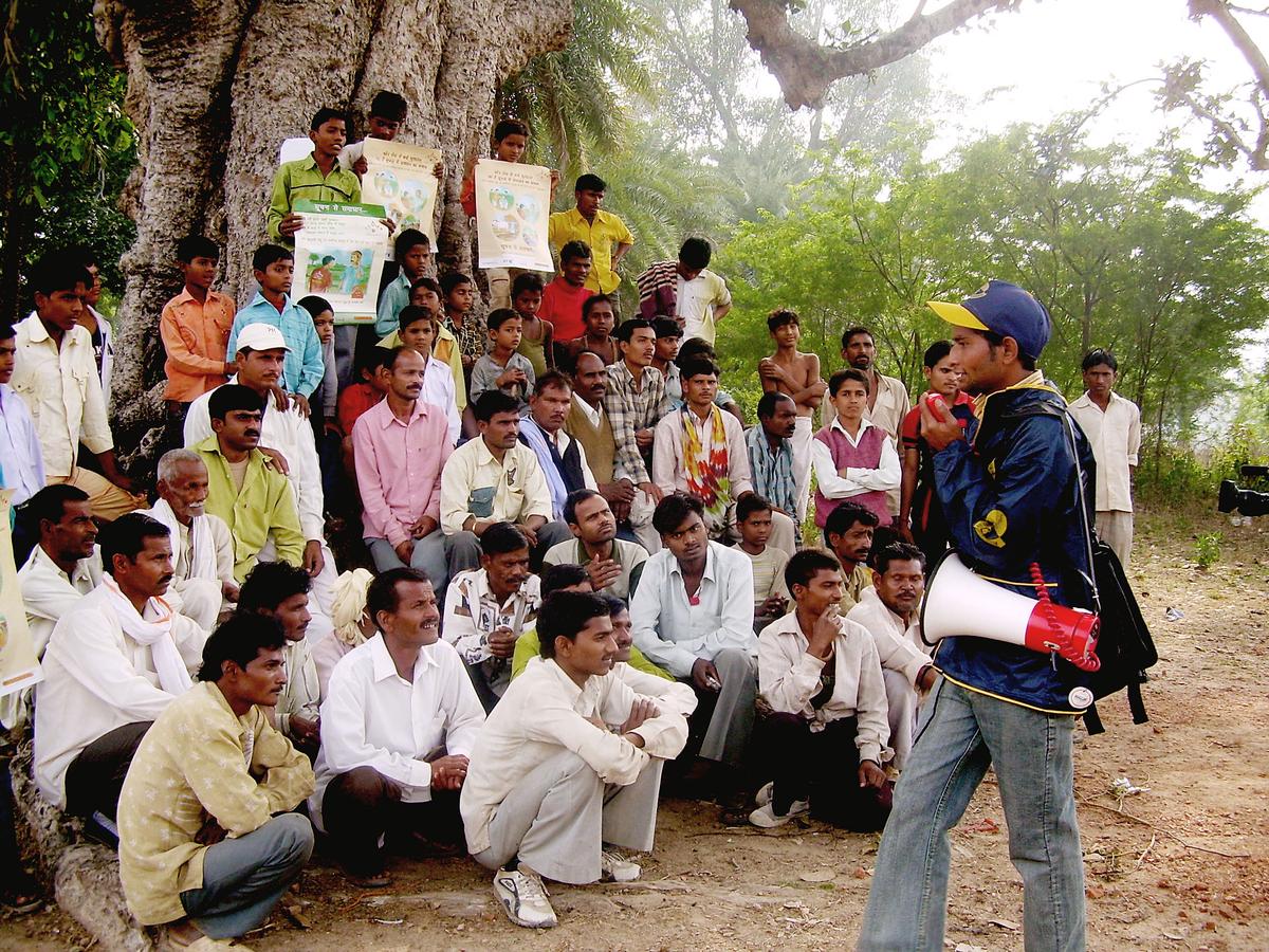A NGO worker meets with a group of farmers teaching them how to use, LifeLine Agri, a mobile phone based application used to connect farmers to a group of knowledge workers in the Indian state of Uttar Pradesh. India has more than 800 million mobile phone subscriptions and the country is set to reap the benefits of information technology in farming. (Courtesy One World Foundation)