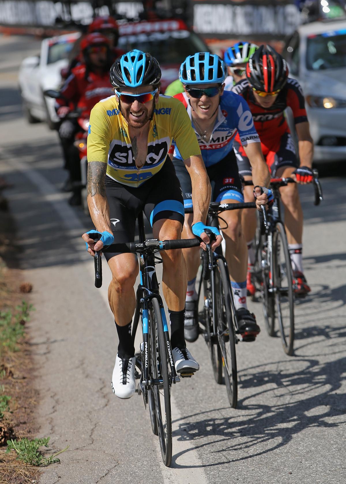 Sir Bradley Wiggins of Sky defends the overall race leader’s yellow jersey against Rohan Dennis of Garmin-Sharp and Peter Stetina of BMC on the final climb in Stage Six of the 2014 Amgen Tour of California. (Doug Pensinger/Getty Images)