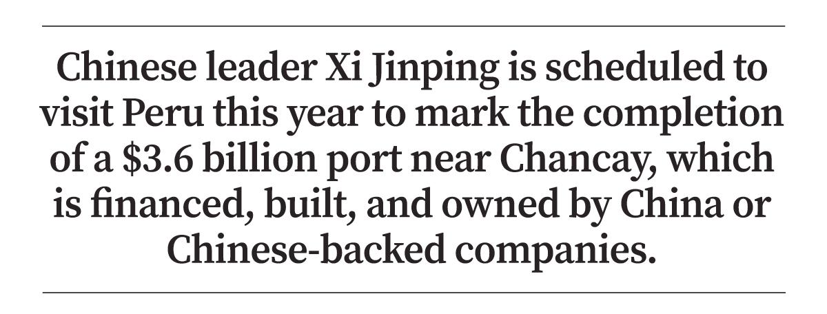 Chinese leader Xi Jinping is scheduled to visit Peru in the latter half of 2024 to mark the completion of a $3.6 billion port near Chancay, which is financed, built, and owned by China or Chinese-backed companies.