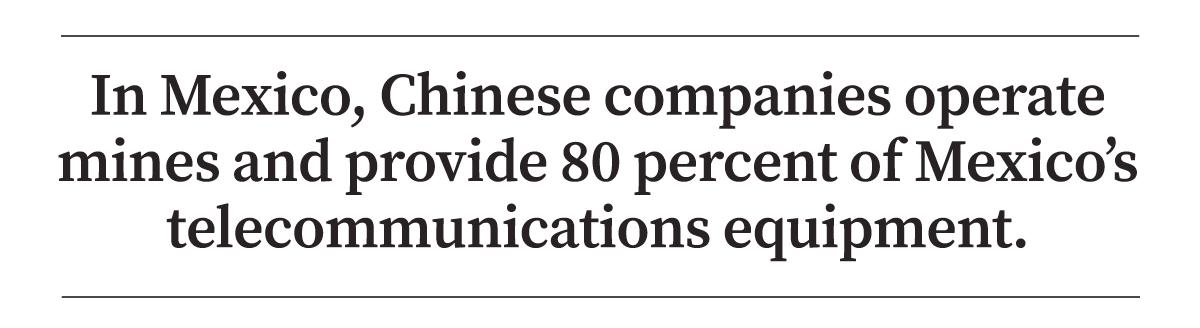 In Mexico, Chinese companies operate mines and provide 80 percent of Mexico’s telecommunications equipment. China’s CCCC is also building part of the Maya Train rail system across five states in Mexico.