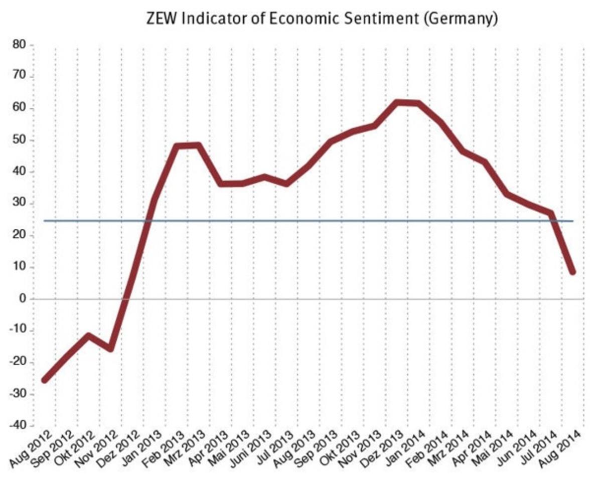 However, the sanctions imposed by the EU as a result of the conflict between Ukraine and Russia have started to hurt. The latest data shows that confidence among German investors took nose-dive in August, bringing Europe’s largest economy to a standstill (see the chart below).