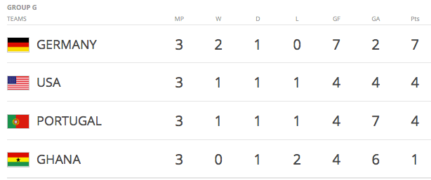 Germany and the United States both have four points, while Ghana and Portugal have one each. Both Germany and the U.S. could even afford to lose and still advance, depending on the outcome of the other match. Germany has an edge because of its superior goal difference (+4) over the Americans (+1).
