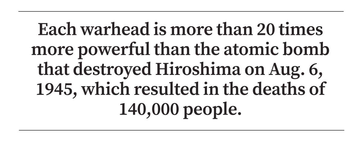 Each warhead is more than 20 times more powerful than the atomic bomb that destroyed Hiroshima on Aug. 6, 1945, which resulted in the deaths of 140,000 people.
