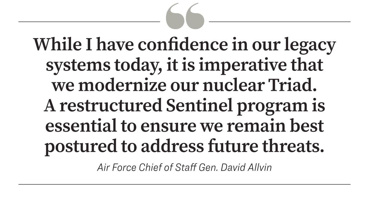 “While I have confidence in our legacy systems today, it is imperative that we modernize our nuclear Triad. A restructured Sentinel program is essential to ensure we remain best postured to address future threats.”