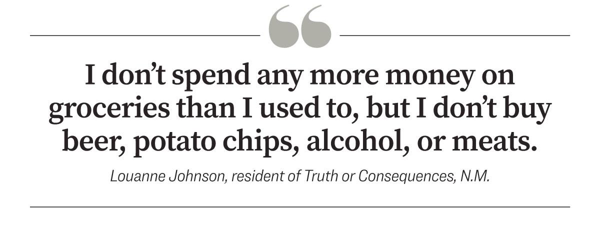 “I don’t spend any more money on groceries than I used to, but I don’t buy beer, potato chips, alcohol, or meats,” she said.