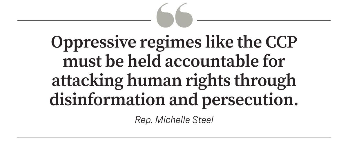 Rep. Michelle Steel (R-Calif.) has previously called for legal means to combat the regime’s transnational suppression of dissidents. Like the others, she said she believes there needs to be liability for what Beijing is doing.