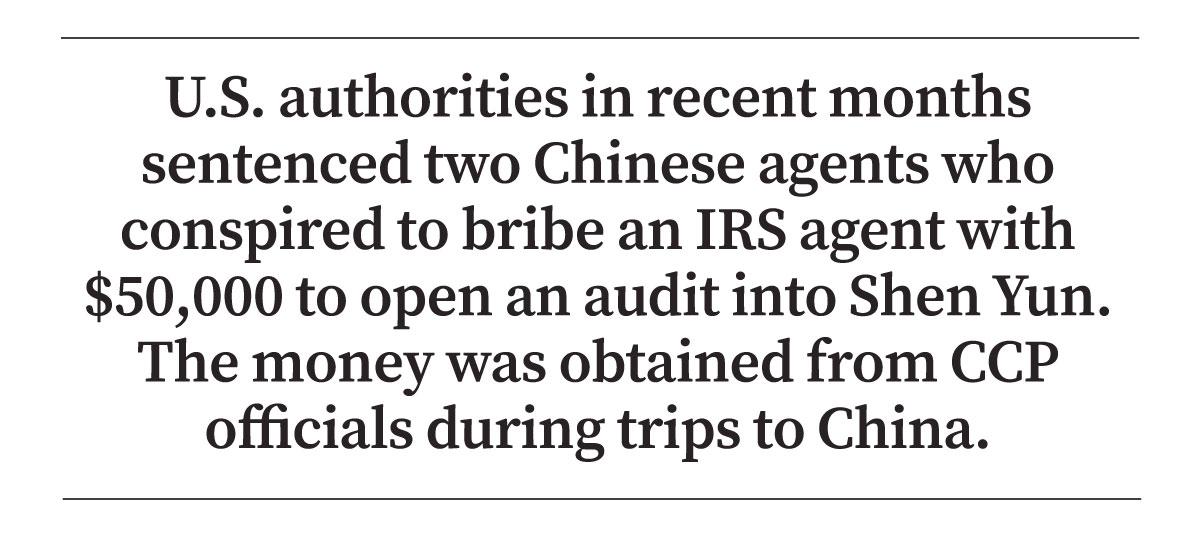 U.S. authorities in September and November sentenced two Chinese agents who conspired to bribe an IRS agent with $50,000 to open an audit on Shen Yun. The money was obtained from CCP officials during trips to China.
