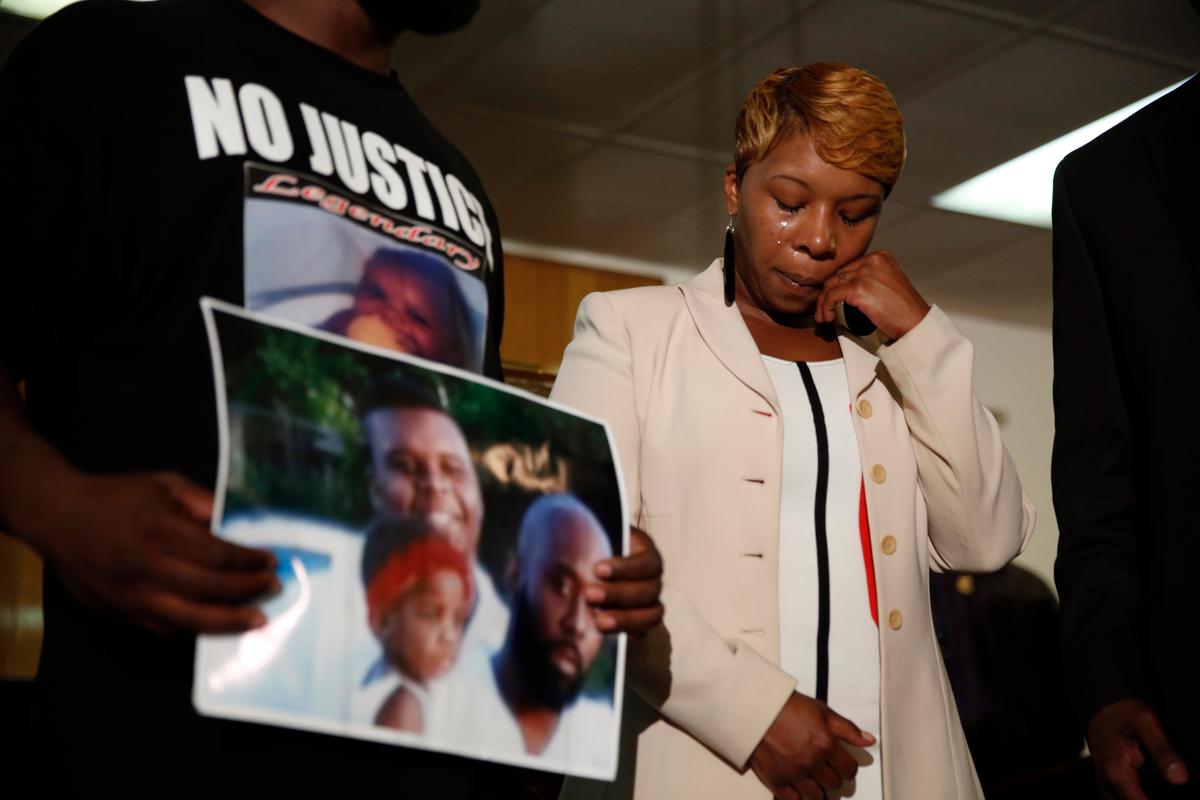 In this Aug. 11, 2014, photo Lesley McSpadden wipes away tears as Brown’s father, Michael Brown Sr., holds up a family picture. (AP Photo/Jeff Roberson)
