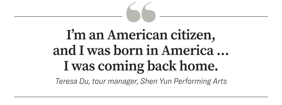 Ms. Du is a tour manager for New York-based Shen Yun Performing Arts, whose eight touring groups perform in venues around the world each year. Ms. Du’s group had just returned from a tour in Europe and was set to next perform in Rosemont, Illinois.