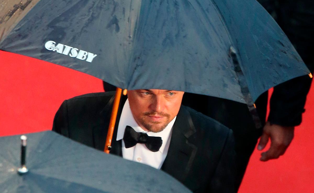 Actor Leonardo DiCaprio holds an umbrella as he arrives for the screening of the film The Great Gatsby ahead of the opening of the 66th edition of the Cannes Film Festival in Cannes, France on Wednesday, May 15, 2013. (AP Photo/Loic Venance, Pool)