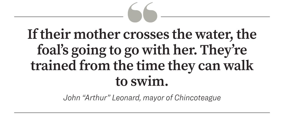 “If they can walk, they can swim,” he says. “It’s their nature. They’re with their mothers. If their mother crosses the water, the foal’s going to go with her. They’re trained from the time they can walk to swim.”