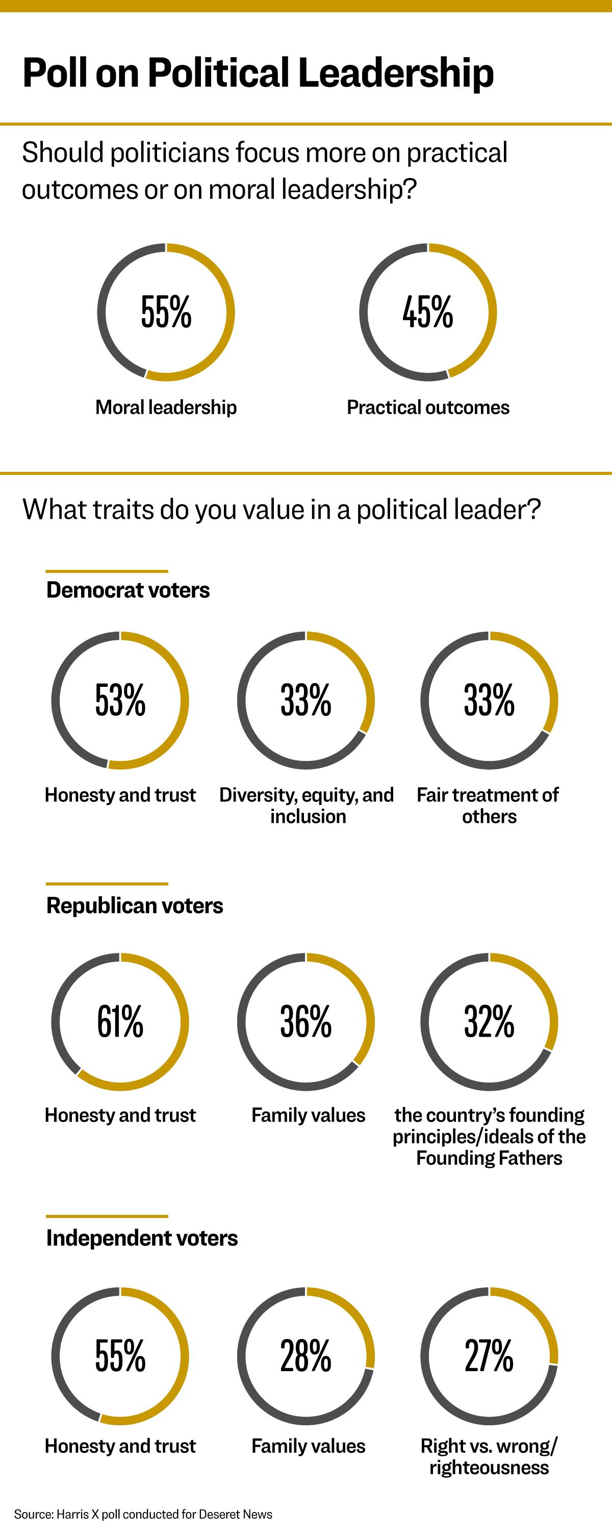 A national poll conducted by Harris X in the summer of 2023 found that a majority of Americans thought that politicians should focus more on moral leadership than on practical outcomes. When asked a second question “What do you most closely associate with moral leadership?” a majority of Democrats, Republicans, and Independents selected trust and honesty for the top of the list.