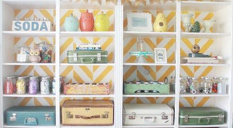 Even partially obscured, a stenciled back wall creates a whole personality for this craft storage space.