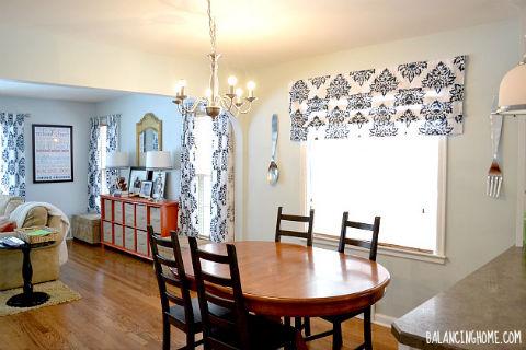 This simple living and dining room space gets a vivid modern upgrade with stenciled faux roman shades and drapes.