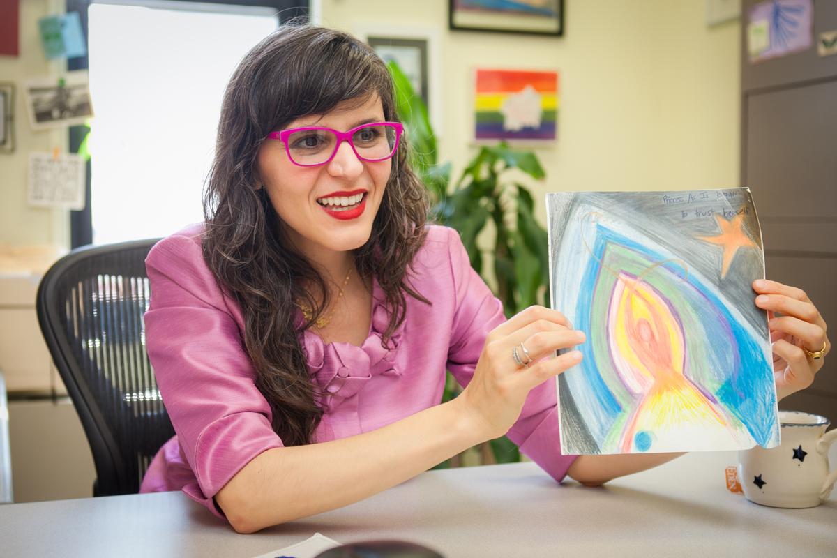 Horowitz-Prisco holds an illustration for an unpublished children’s book she wrote that encourages children to accept themselves.(Benjamin Chasteen/Epoch Times)