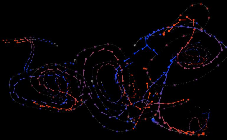 This visual representation shows a tracked tiger beetle’s trajectories as it chases prey. By observing a beetle’s chase, scientists have derived a physical law that it follows to optimize its predation strategies. (Jane Wang/Cornell University)