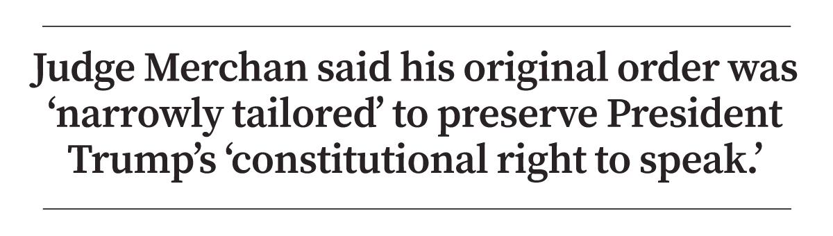 The restrictions were needed because of President Trump’s “longstanding and perhaps singular history of using social media, speeches, rallies, and other public statements” to attack his perceived adversaries, Mr. Colangelo said.