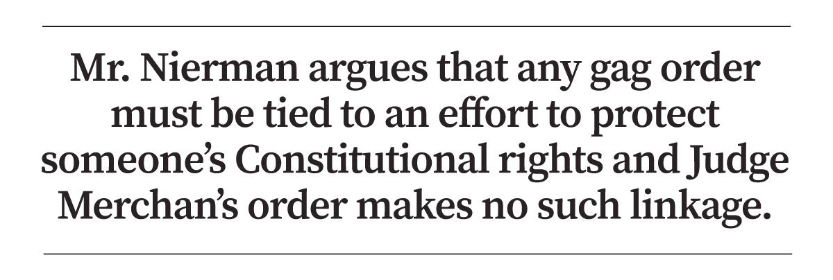 Mr. Nierman argues that any gag order must be tied to an effort to protect someone’s Constitutional rights. But Judge Merchan’s order makes no such linkage. Instead, the judge says he was taking the action to further “the state’s interest in the fair administration of justice.”