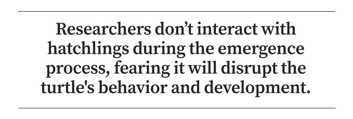 Interaction with hatchlings, even by researchers, is discouraged out of concern that it will disrupt the turtles’ behavior and development in ways not yet understood.