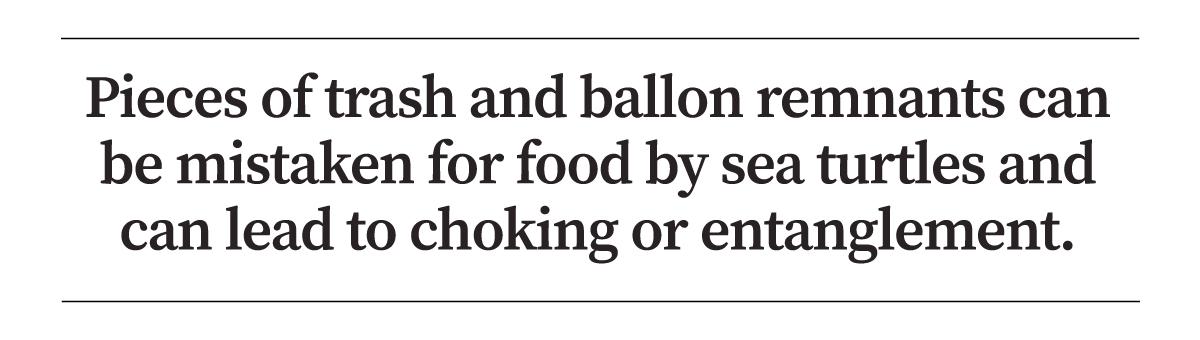 When balloons pop and drift down, the remnants can be mistaken for food by sea turtles and other creatures. Even cows have died from ingesting balloons. Balloon strings can be deadly, too, causing entanglement, drowning, and strangulation.