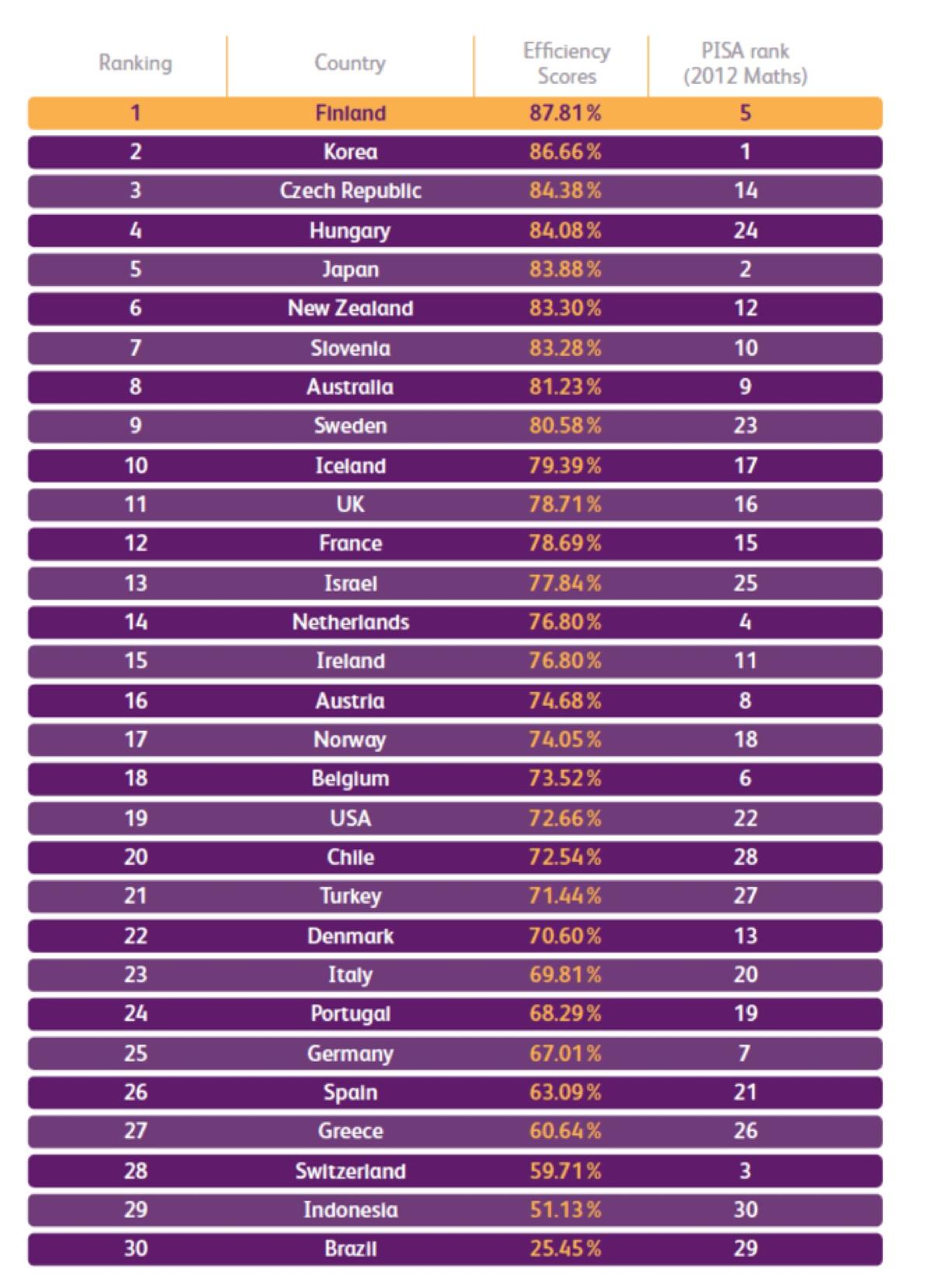 The Efficiency Index we present is therefore a relative measure. Finland has been calculated to be operating at the notional maximum, but even that system could achieve more with less. For example, each education system needs to decide how much funding to invest in teaching materials, infrastructure, reducing class sizes, or more highly paid teachers.