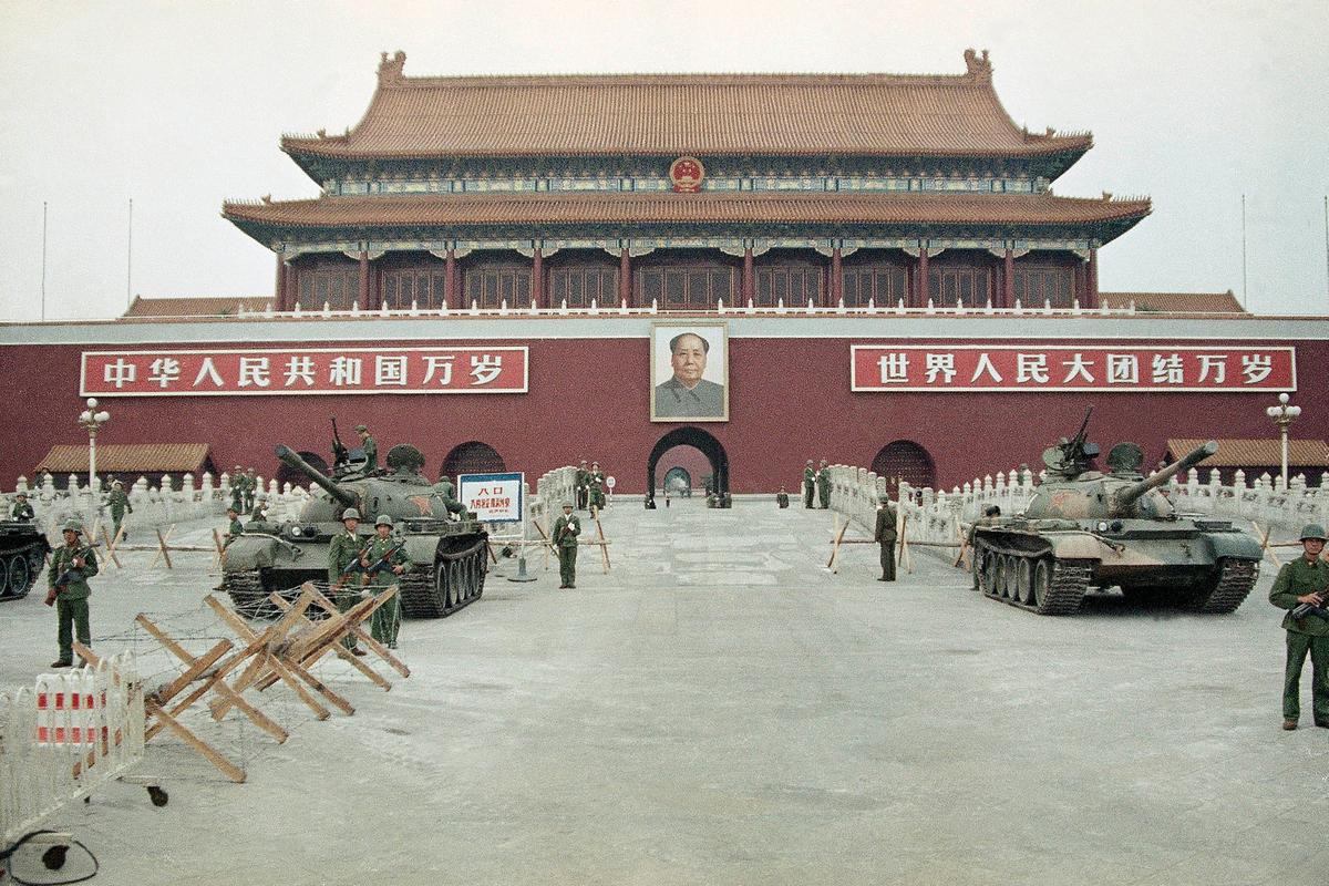 In this June 10, 1989, photo People’s Liberation Army (PLA) troops stand guard with tanks in front of Tiananmen Square after crushing the students pro-democracy demonstrations in Beijing. (AP Photo/Sadayuki Mikami)