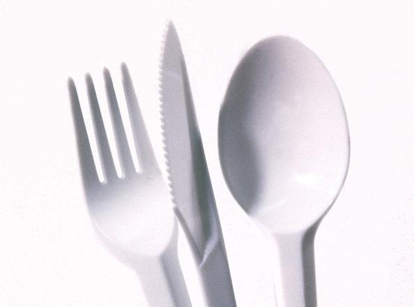 Cutlery, Plastic Knife Spoon Fork. (Photo by Jeff Overs/BBC News & Current Affairs via Getty Images)