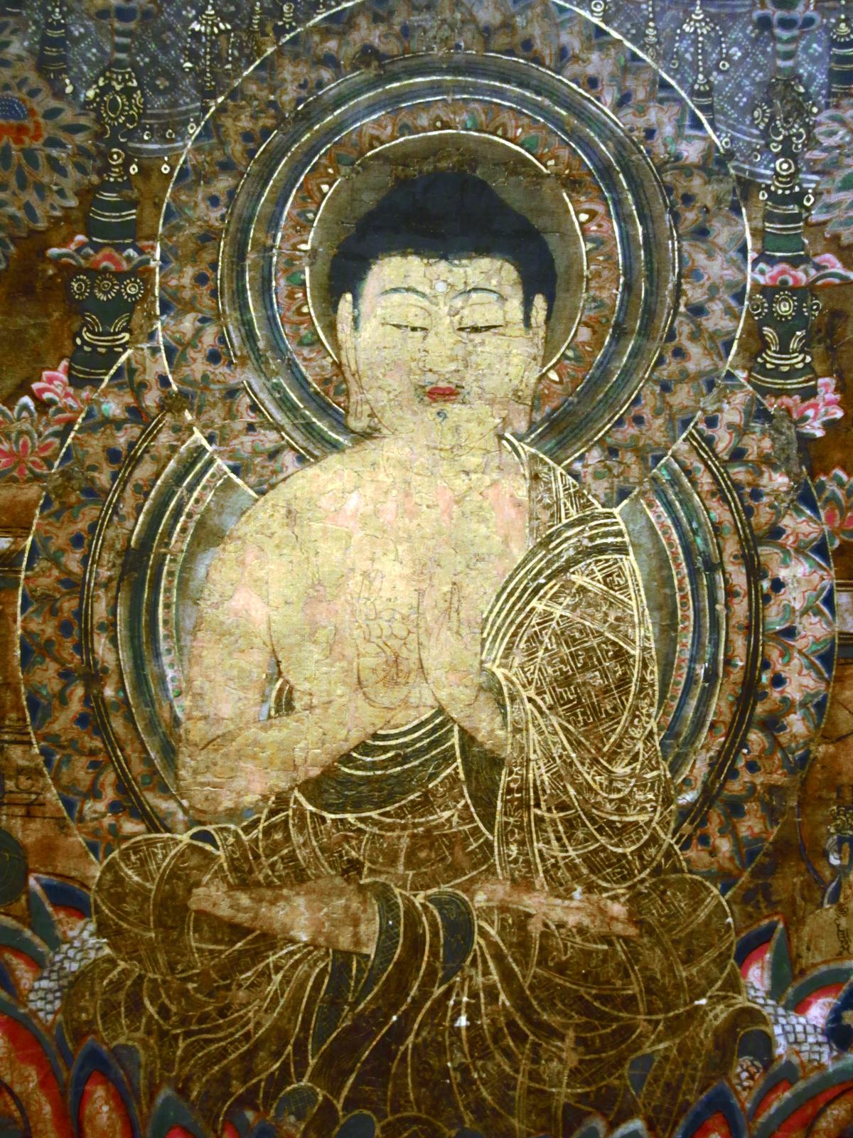 A current exhibition at the Asian Art Museum shows Amitabha, the Buddha of the Paradise of Ultimate Bliss, in a painting from Japan. Amitabha, Buddha of the west, 1300–1400, Japan, ink, colors, and gold on silk, detail. (Cornelia Ritter/Epoch Times)