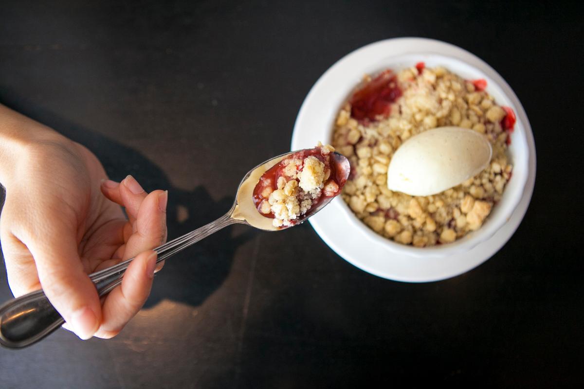 Strawberry-Rhubarb Crisp with Oat Streusel and Smoked Vanilla Ice Cream (Samira Bouaou/Epoch Times)