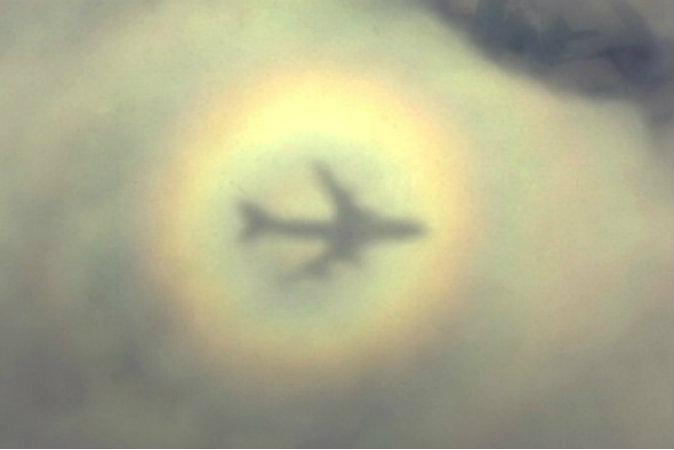 Photo of a brocken spectre taken by a passenger in a Boeing 747 airplane. A brocken spectre is a phenomenon by which the observer’s shadow is surrounded by rainbow fringes. (M. Royon)