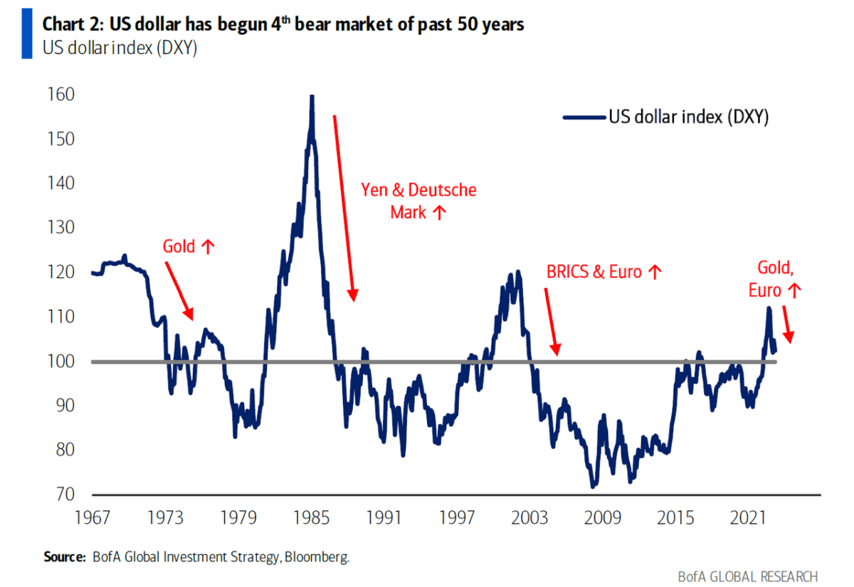 Michael Hartnett, Bank of America’s chief investment strategist, for example, wrote in a recent note to clients that “U.S. dollar debasement” is now a “new favorite theme.” He recounts the dollar’s double-digit decline since last September, in conjunction with gold spot price above $2,000 per ounce and bitcoin’s rise to above $30,000 as signs that the U.S. dollar will soon enter its “fourth bear market of the past 50 years.”