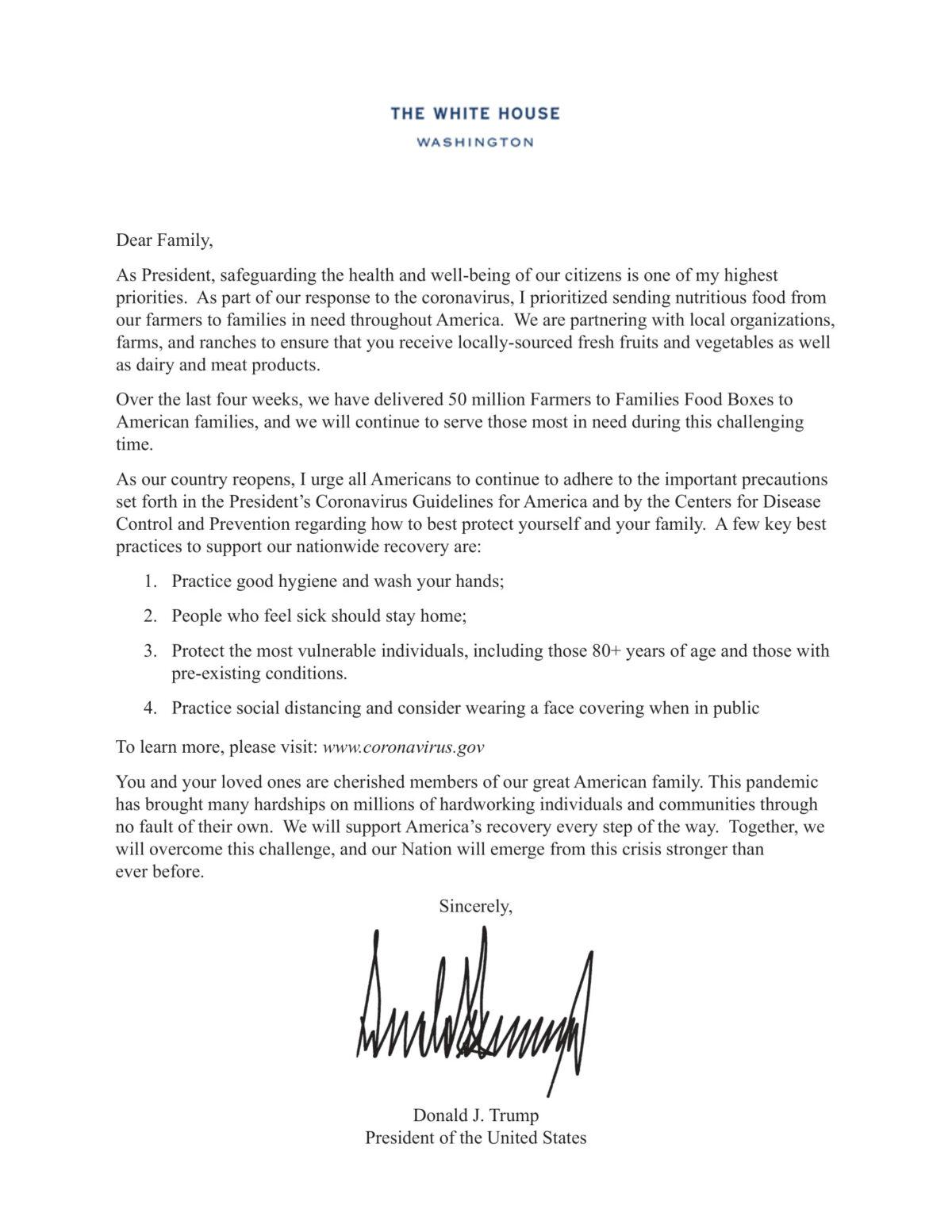 Through its $4 billion “Farmers to Families” program, the U.S. Department of Agriculture (USDA) has distributed over 100 million family-sized boxes of fresh produce, dairy, and meat products—which should have gone to restaurants, hotels, and cafeterias if not for the CCP (Chinese Communist Party) virus pandemic—to families in need. Starting from October, a letter signed by Trump is added to those food boxes.
