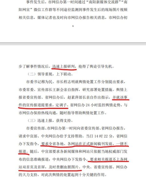 The document also showed that local and central government authorities often coordinate to ensure that their propaganda narratives sync up.For example, on Sept. 22, 2016 in Sui county, a kindergarten school bus crashed with a big truck, causing multiple casualties. State media outlets gave two different numbers of casualties. Henan Business Daily and Dahe Daily reported 6 dead and 28 injured with photos from the scene; while Xinhua reported only 13 injured, including 2 in critical condition. Soon, Dahe Daily’s report was deleted. The document recorded that after the incident, the Shangqiu city Cyberspace Administration interrogated and scolded several officials who managed the government social media accounts, as they posted and shared “false information.”